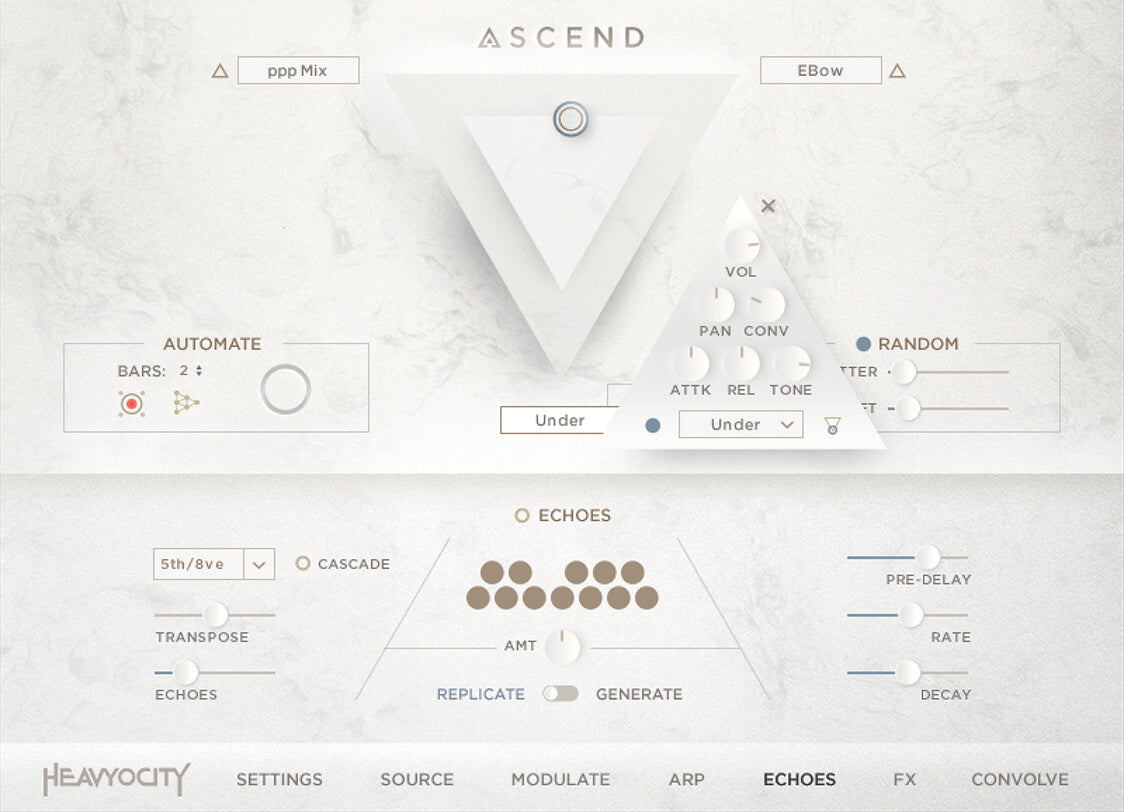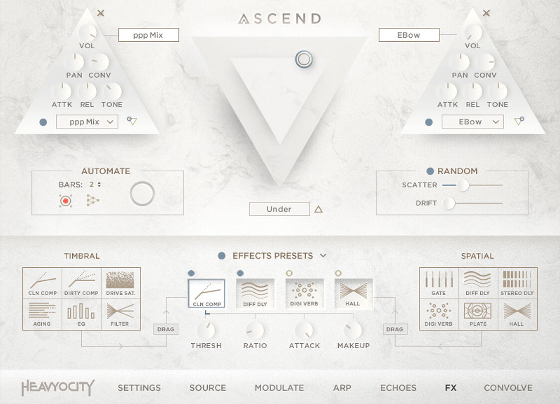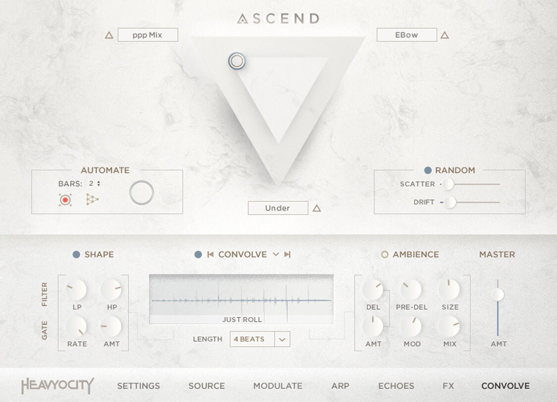 The gorgeous ASCEND engine is a whole new world to explore—complete with a library of rhythmic convolutions and dozens of layerable sources and FX. The highly-flexible three-point mixer provides instant inspiration, while the all-new Echoes feature accompanies performances with a lush, musical randomness.