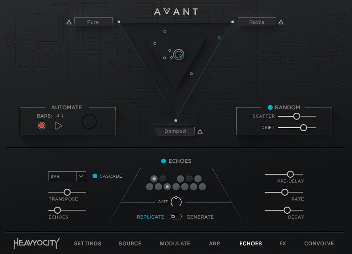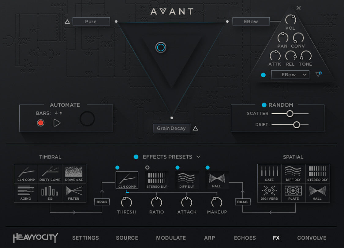 With the powerful and flexible interface, the sound sources in AVANT can be taken to an entirely new level, allowing for complete customization by layering, modulating, and processing up to three different sources at the same time.