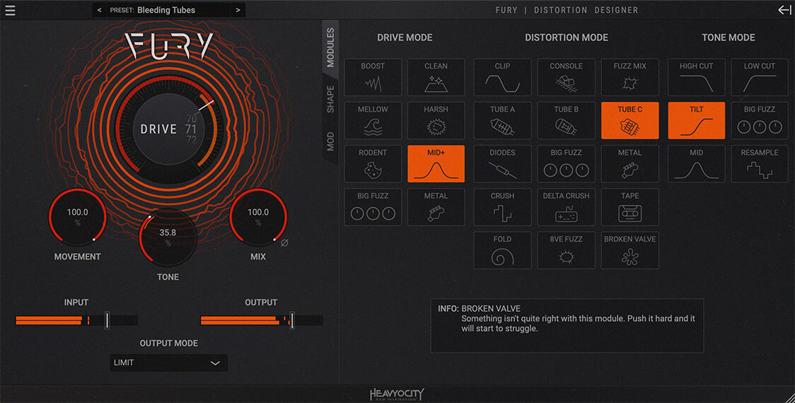 Design your sound with Heavyocity’s FURY, a bold distortion VST plugin featuring a wide range of distortion flavors for guitars, bass, and more—from subtle warmth to hard clipping, lo-fi crush to analog-modeled circuitry, and simple to chaotic. The FURY distortion VST will shape, mangle, and crunch your sound with aggressive precision.