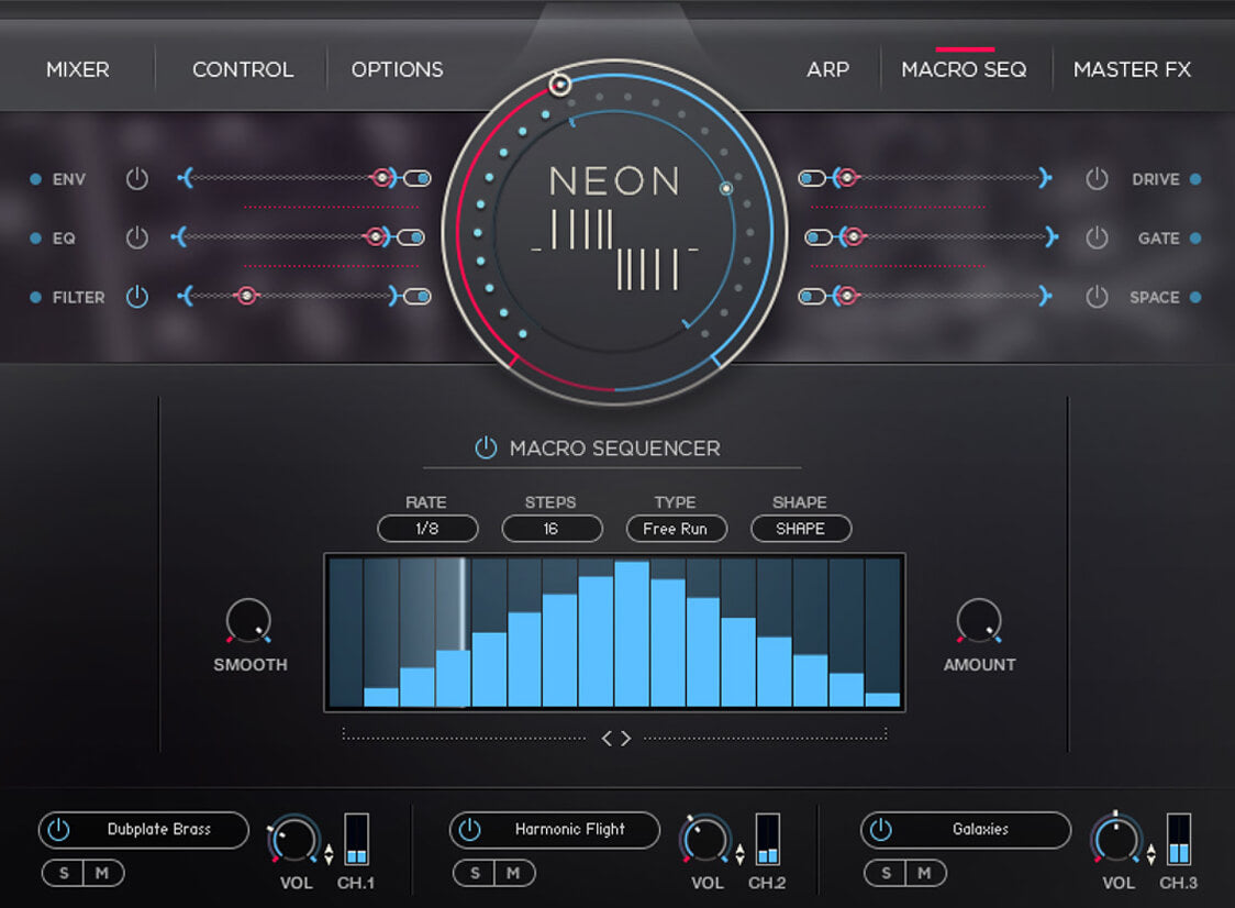 Mosaic Neon's compelling content rejuvenates vintage sounds, but its real power lies in the captivating textures and exciting rhythmic features that emerge when they are layered across the Mosaic Engine's three channels, resulting in a rich and dynamic sonic landscape.