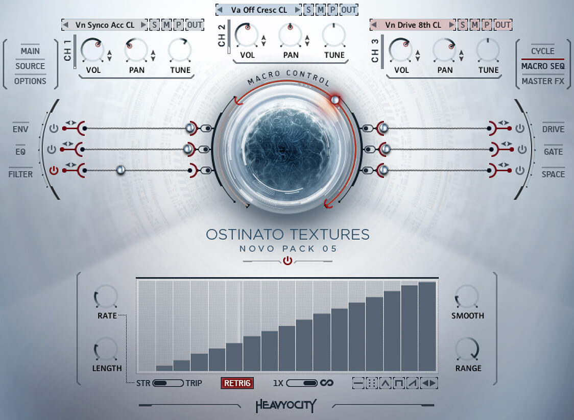 The award-winning NOVO engine inspires and enables true creativity for the modern composer. Use MACRO CONTROL to modulate and automate multiple parameters across each channel, or quickly create rhythmic pulses, swells, and granular-style pads with the acclaimed CYCLE feature.