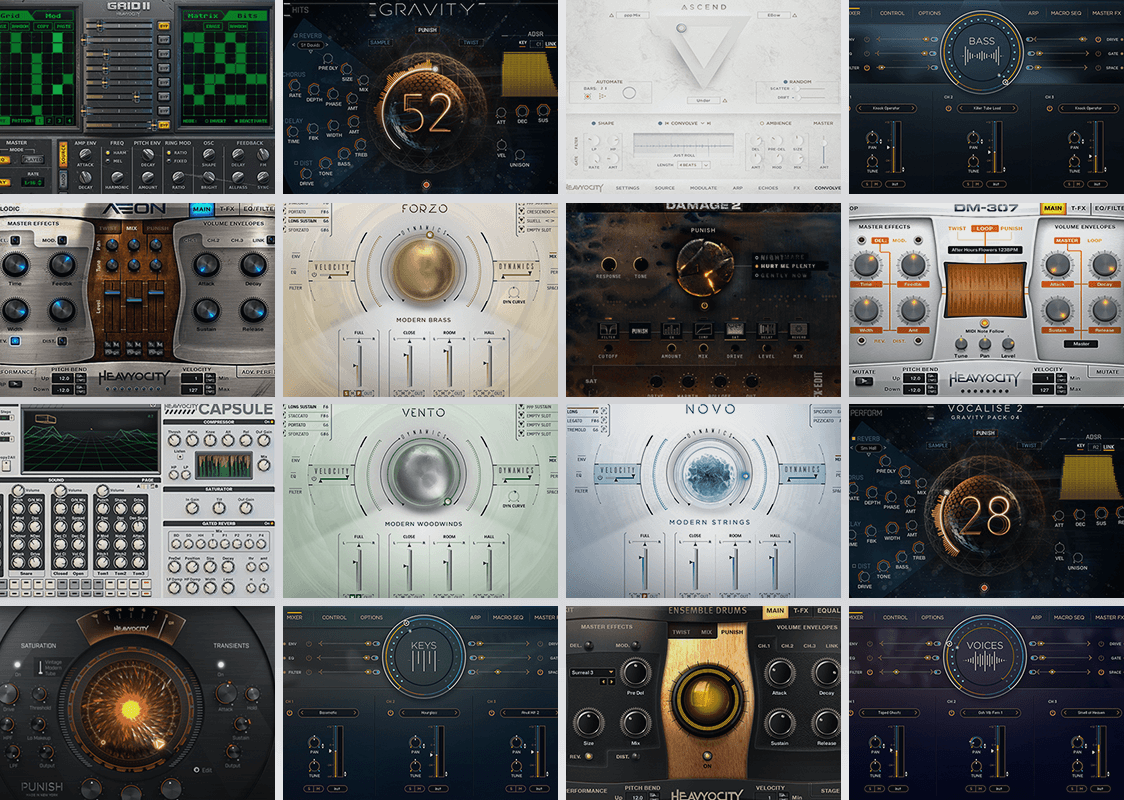 Our full range of virtual instruments and effects -- complete with everything you need to compose modern scores for film, television, and video games. Strings, brass, percussion, vocals, piano, synth, guitar, bass, plus an almost-infinite arsenal of Heavyocity's signature hybrid and sound design elements.